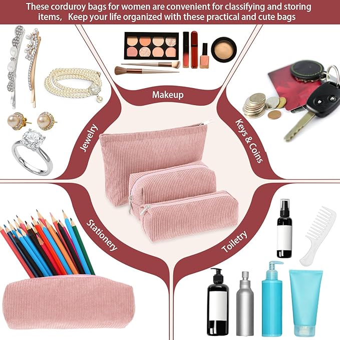 - Material and Attractive Design: the makeup and toiletry travel bag set is mainly crafted from quality corduroy material, ensuring high durability and prolonged service life; The bags feature solid pink color design in different sizes; This makes them compatible with various styles of outfits