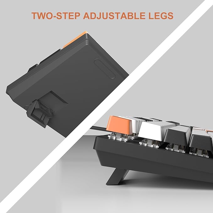 - DESIGNED FOR COMFORT: The mechanical keyboard adopts premium metal panel construction to make it stable. Ergonomic key layout fits your fingers perfectly and reduces typing fatigue. Two-step keyboard feet allow you to set your keyboard up at 3 different tilt angles. No driver needed, just plug and play.
