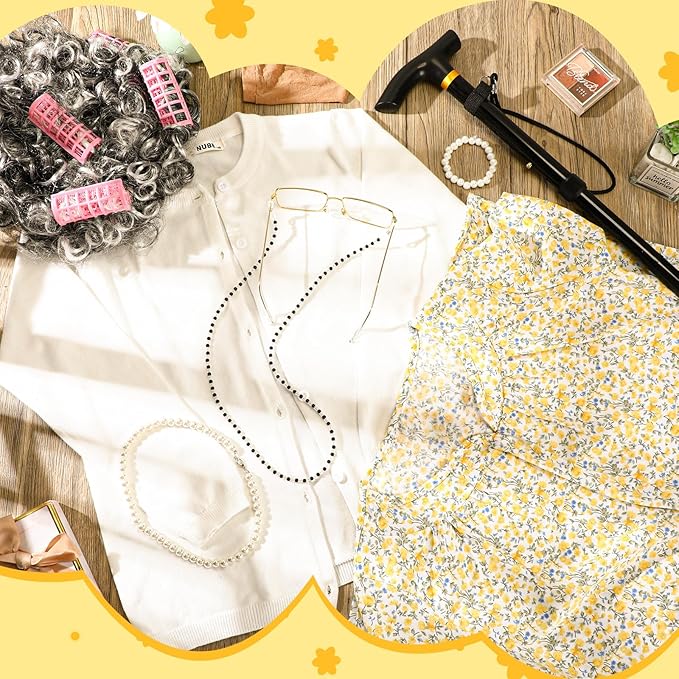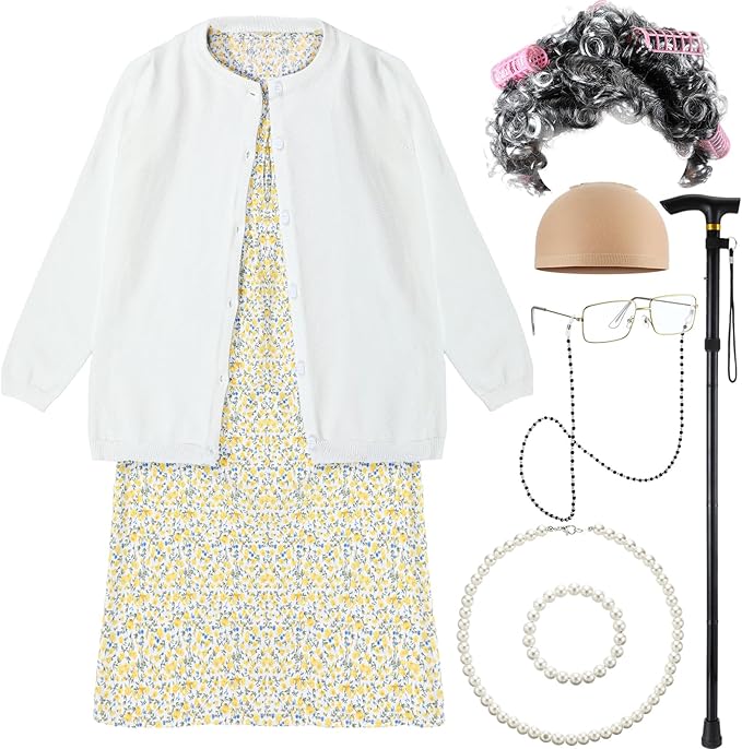 - Fully Immersive Granny Costume Experience: the package includes an old lady dress, a white cardigan, an old lady wig, a fake hair net, a folding old lady cane, a pair of glasses, a glasses chain, an artificial pearl necklace, and an artificial pearl bracelet; This comprehensive 100th Day of School girls old lady costume is sure to meet your cosplay needs and craft a realistic old woman image, bringing fun and laughter to your celebration