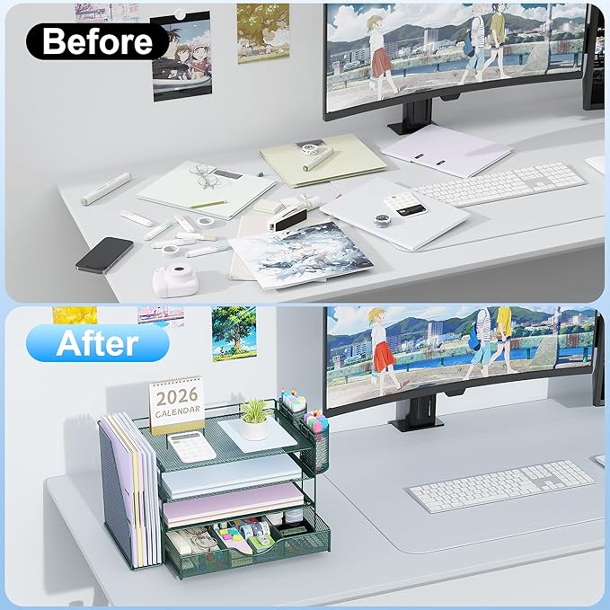 - 📂【Save Space】: The office organizer fully utilizes the vertical space of the desktop, creates the largest possible storage space, accommodates various office desk accessories, and saves space.