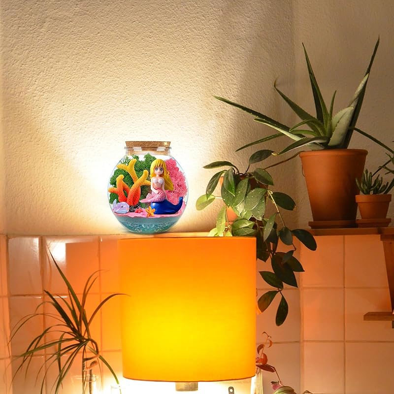 - [Complete DIY Terrarium Set]: 30 pcs Comes with everything needed to create kids own magical mermaid and unicorn terrarium. The mermaid and unicorn night light includes a cone jar and a round jar, preserved moss, sand, crystals, starfish, shell, fence, mermaid, moon, house, fish, remote control, light-up jar lid and User Manual make the scene look even more real and creates an astonishing sight.