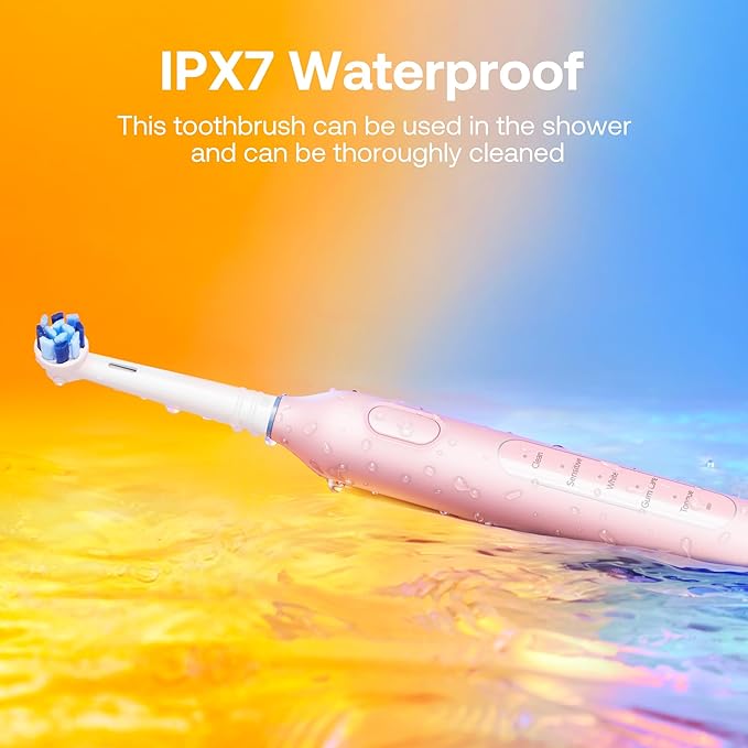 - 2-Minute Smart Timer & IPX7 Waterproof: With a built-in timer that pulses every 30s, this electric toothbrush ensures thorough cleaning by guiding your brushing routine across all mouth quadrants; It's waterproof design allows for easy use in the bathroom