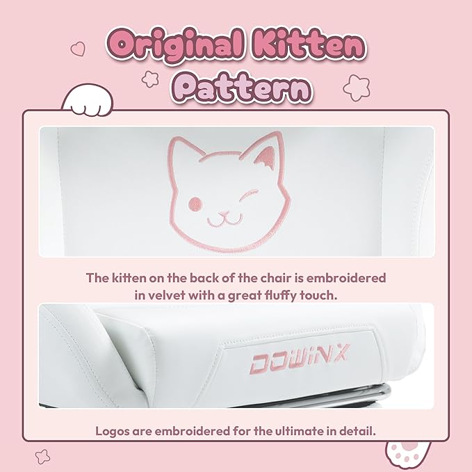 - Textured Design: The gaming chair uses a leather finish overall, but uses a plush-feeling fabric at the backrest and cushion. This allows the chair to be twice as cute while also increasing breathability and placing heat and moisture buildup. The original cat head logo and brand logo are presented using embroidery, which is a more sophisticated way to present this chair.