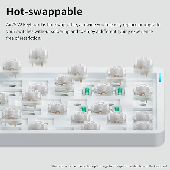 - Supports multi-device connectivity: Air75 V2 wireless mechanical keyboard is compatible with Mac/Windows/Linux/Android/iOS,and supports Bluetooth 5.1 connectivity, 2.4g connectivity and wired connectivity modes, which allows you to connect up to 4 computer devices at the same time and switch between these computers to use them, which can satisfy a wide range of entertainment office needs