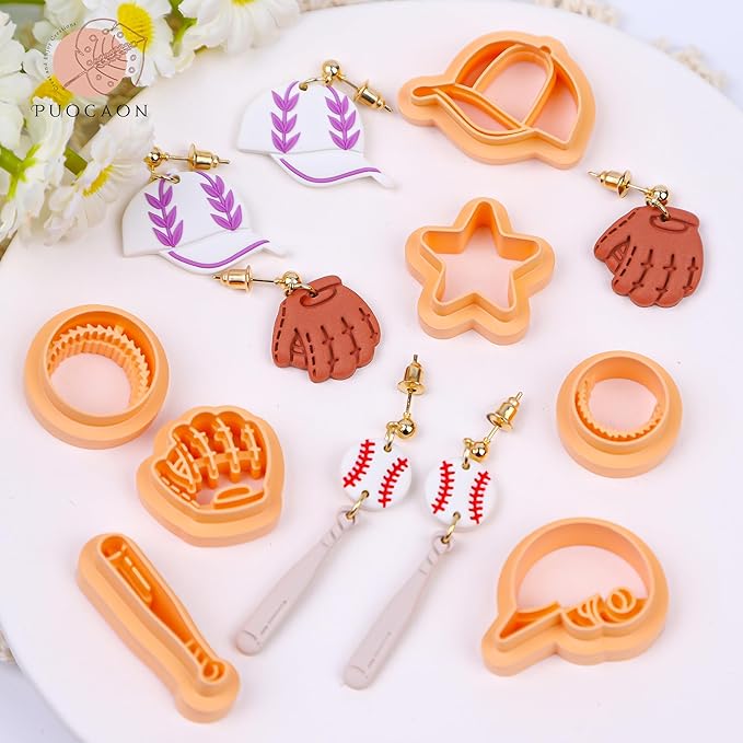 Puocaon Baseball Polymer Clay Cutters - 12 Pcs Sportswear Clay Cutters for Polymer Clay Jewelry, Star Baseball Cap Bat Clay Cutters for Earrings Making, Baseball Glove Polymer Clay Cutters for Earring