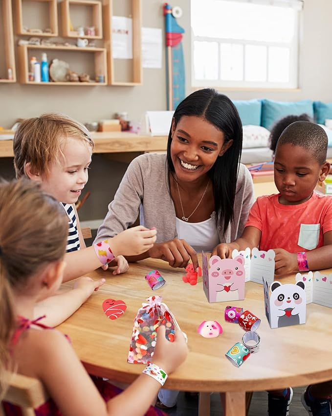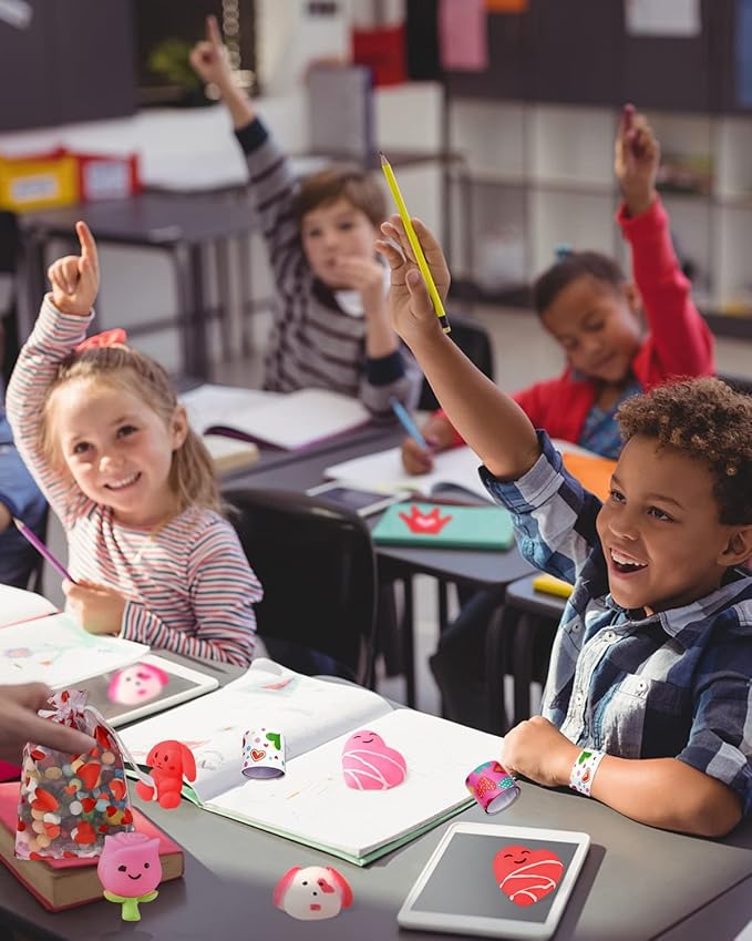 - Valentines Day Party Favors - Add a touch of joy to Valentine's Day school exchanges with our delightful gift set. Featuring 6 valentines cards for kids classrooms tailored to children's tastes, and accompanied by two fun toys—a slap wristband and squish toy—this set is sure to bring cheer to the festivities.