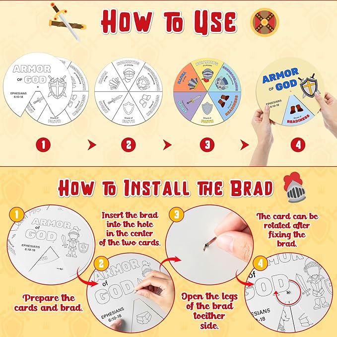 - Value Set: It comes with 48pcs Armor of God coloring cards, 4 different kinds patterns and each kind has 12pcs as well as having 24 brads for assembling the card to reach the rotating card. The cards measure about 8.7 inch x 8.7 inch.