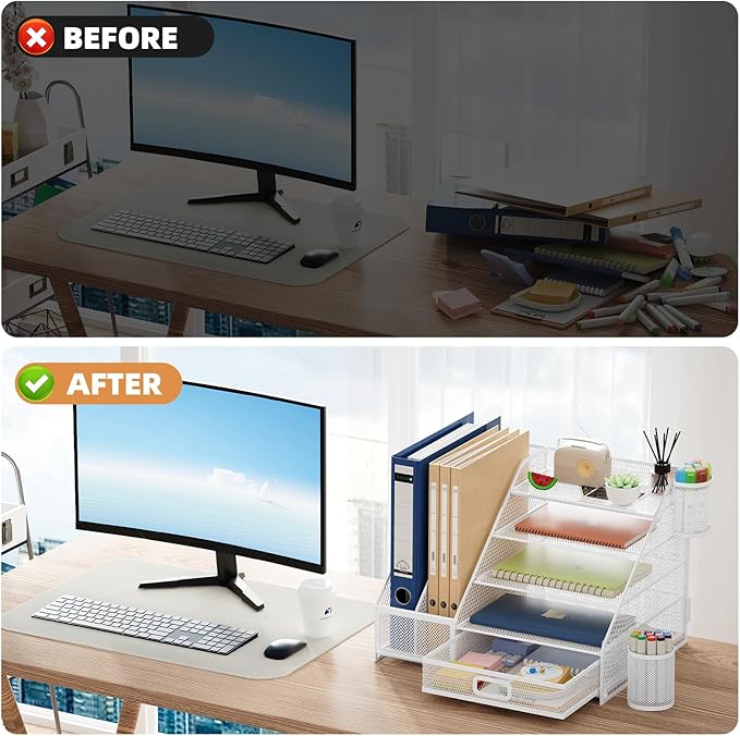 - 【Large Capacity】The desk organizer maximizes both the storage area and your desk's available space. For your notebooks, magazines, letters, and A4 paper, the ladder paper tray organizer would provide ample space. If you have documents and folders to store, consider using the vertical file holder to keep your office documents in order. The drawer organizer and hanging pen holder are enough to accommodate all office supply accessories and so on. Perfect Size:14.4*11*12inch.