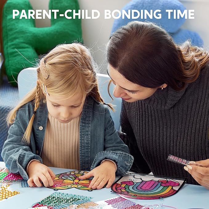 - Complete Crafting Experience: Our craft kit includes everything needed for an immediate start. With 4 pre-printed window designs, 4 color guides, over 1200 gemstone stickers in 9 colors and 2 sizes, 4 ropes, and 4 suction cups, your child can dive into the world of sparkling window art immediately.