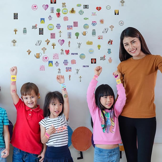 - What you get: each package contains 144 pieces of assorted bible verses slap bracelets in 12 styles, 12 pieces of each style, and 100 pieces bible verses stickers, specially designed for Christian,enough quantity for party favors, teacher's classrooms supplies, birthday party gifts or classroom prizes