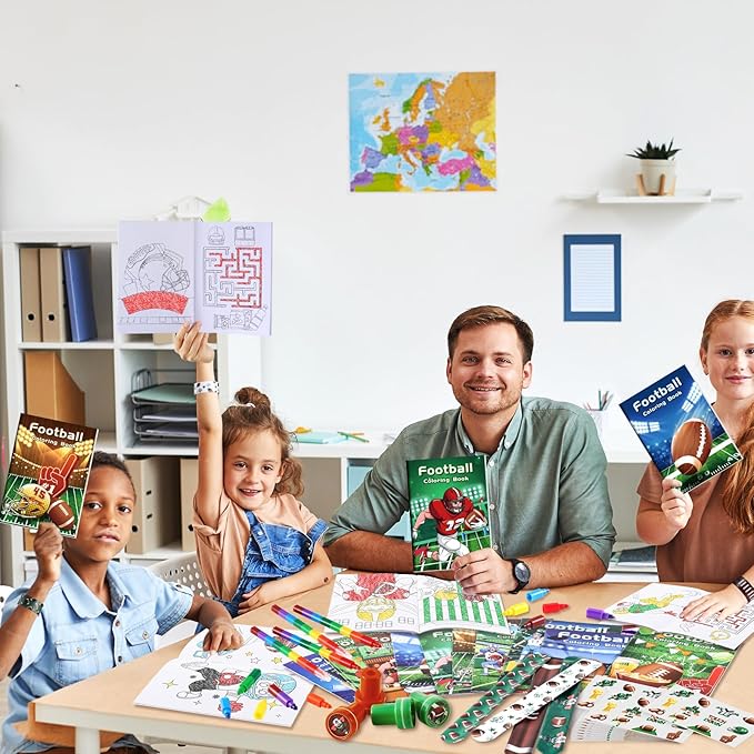 - Suitable Size: Football coloring book for kids about 6.7 x 4.7 inch, Crayons about 7 inch, football slap bracelets about 8.7 x 1.2 inch, football stampers about 1.38 inch, football stickers about 4.7 x 2.7 inch, Football party favor set fit in most football themed birthday party goodie bags.