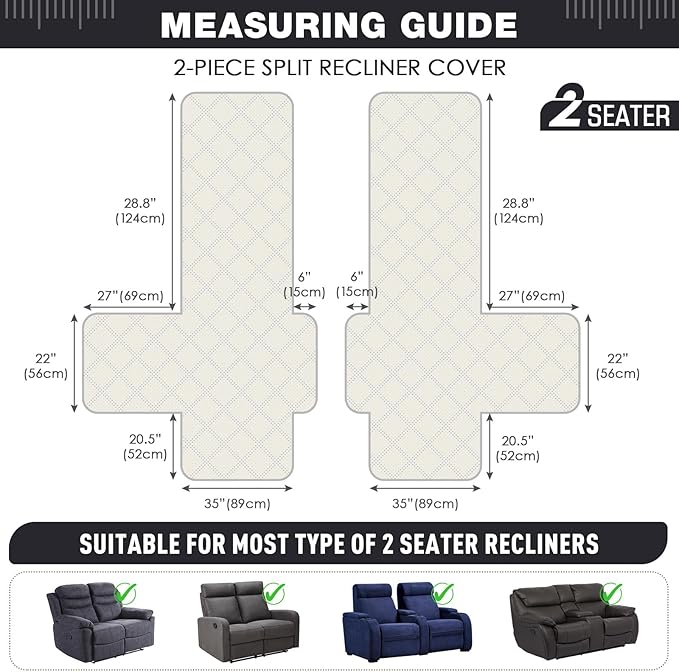 - 【2 SEATER RECLINING FIT】Our 2 seater recliner loveseat cover is designed to fit 2 seater oversized love seat sofas, made with 2 seperate pieces , perfectly fit 70 inch reclining 2 seater sofas. For more details, please refer to the measurement guide in the photo, please measure before purchase