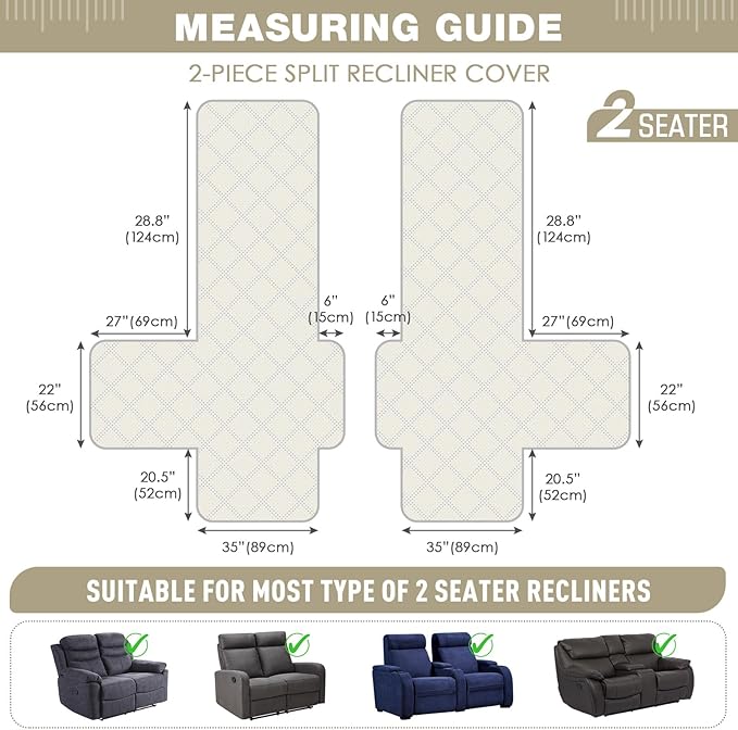 - 【2 SEATER RECLINING FIT】Our 2 seater recliner loveseat cover is designed to fit 2 seater oversized love seat sofas, made with 2 seperate pieces , perfectly fit 70 inch reclining 2 seater sofas. For more details, please refer to the measurement guide in the photo, please measure before purchase