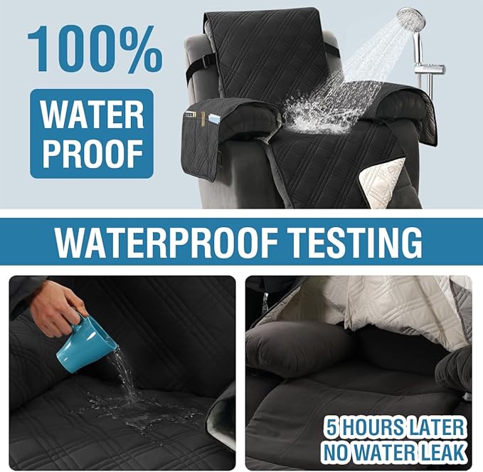 H.VERSAILTEX 100% Waterproof Couch Covers for Reclining Couches Reversible Recliner Chair Covers Furniture Protector with Elastic Straps for Pets Kids Sitting Width Up to 23" (Recliner, Black/Beige)