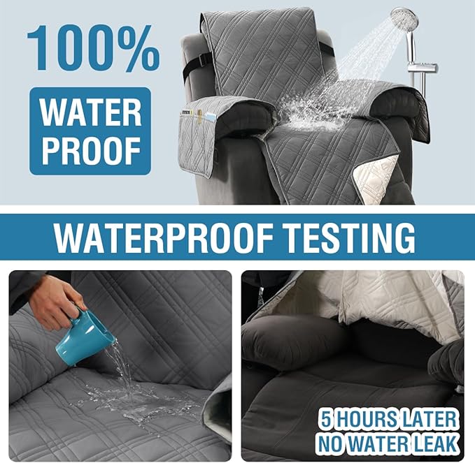 H.VERSAILTEX 100% Waterproof Recliner Chair Covers 1-Piece Reversible Recliner Covers for Large Recliner with Elastic Straps Sitting Width Up to 28" (Oversized Recliner, Grey/Beige)