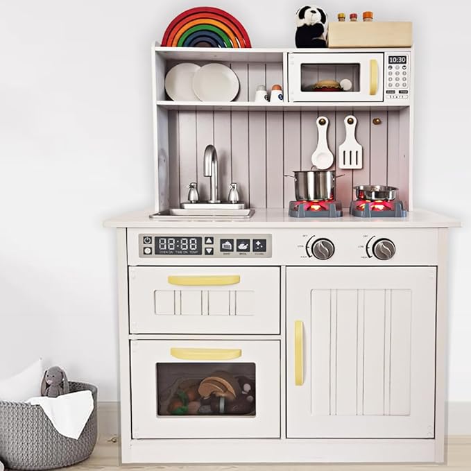 - Toddler kitchen has enough storage space to cultivate children’s storage ability and develop a good habit of tidying things up. Perfect play kitchen for toddlers 3-8. The wooden toy encourages role-playing, problem-solving, and fosters a love for cooking and pretend play game.