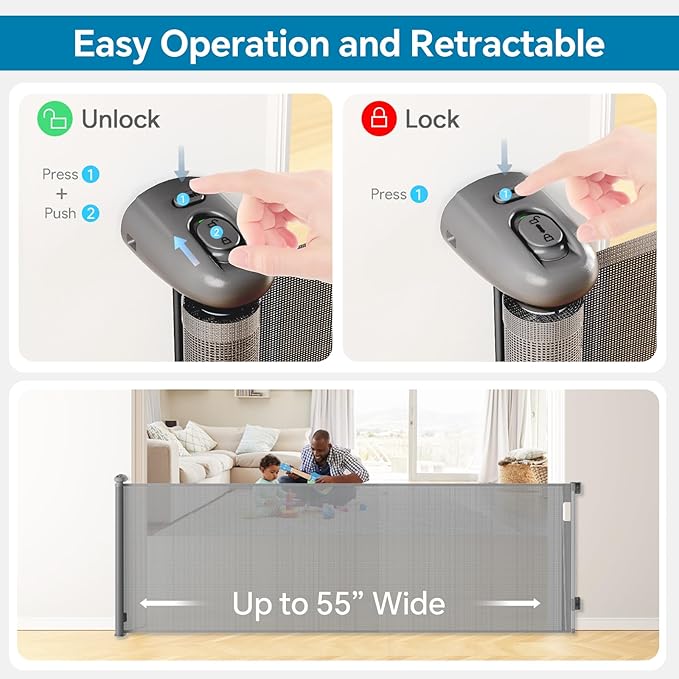 - 【Easy Operation Retractable Gate】Easy to use with just one hand, simply press and push the button to lock and unlock the safety gate, even when you're holding your baby or carrying toys and diapers, baby gate retracted away when not in use, saving space