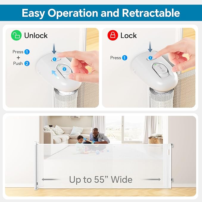 - 【Easy Operation Retractable Gate】Easy to use with just one hand, simply press and push the button to lock and unlock the safety gate, even when you're holding your baby or carrying toys and diapers, baby gate retracted away when not in use, saving space