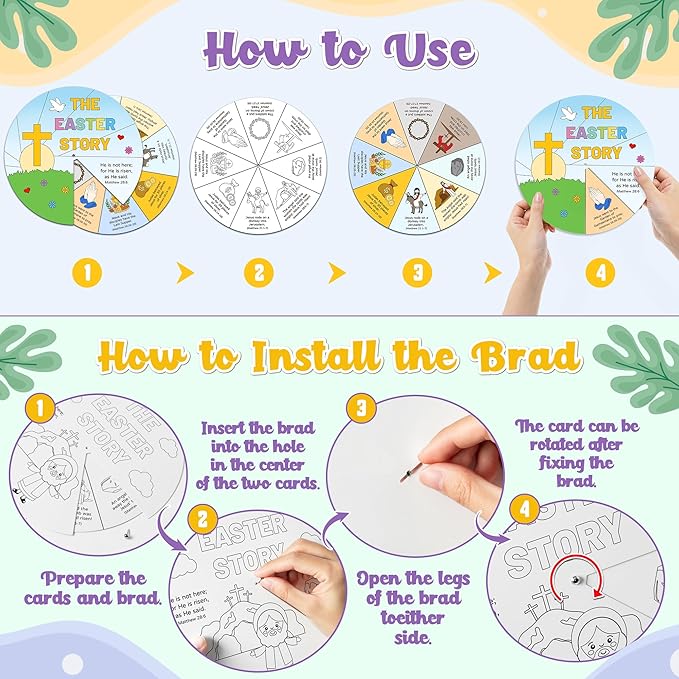COcnny 24 Sets The Easter Story Craft, Color Your Own Easter Jesus Wheel for Kids, Religious Bible Coloring Cards DIY Crafts Art Game for Sunday School Christian Classroom Home Activities VBS Supplies