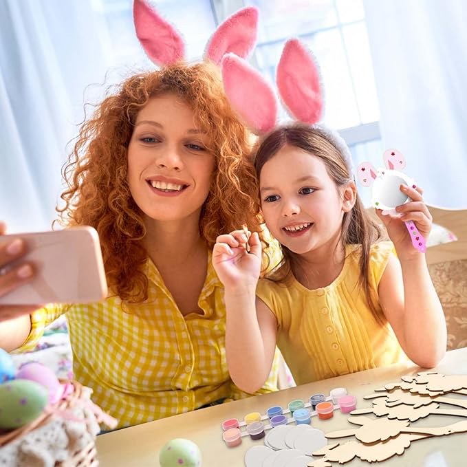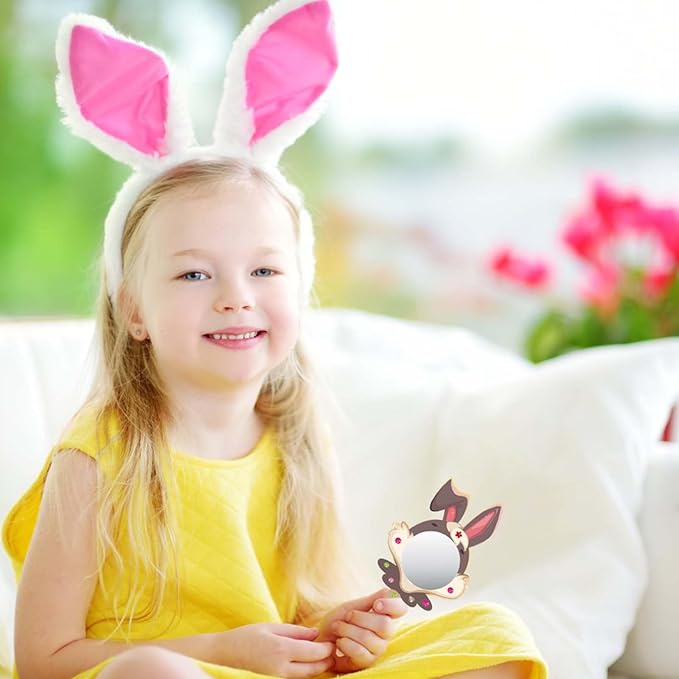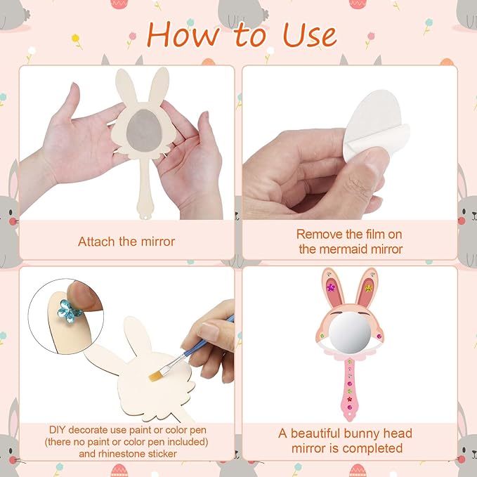 - Mirror Crafts for Kidss: This wooden DIY mirror includes 9x unfinished wooden bunny head cutout ,9x round mirrors,2x paiting brushes 2x paints(12 colors),1x rhinestone sticker, has enough accessories to make wooden mirrors together. Through party activities, you can share this bunny mirror with friends.