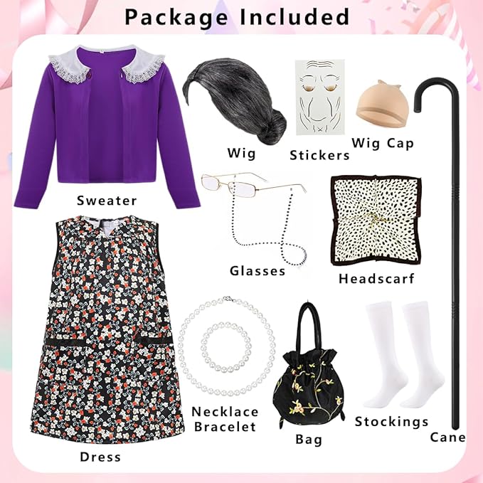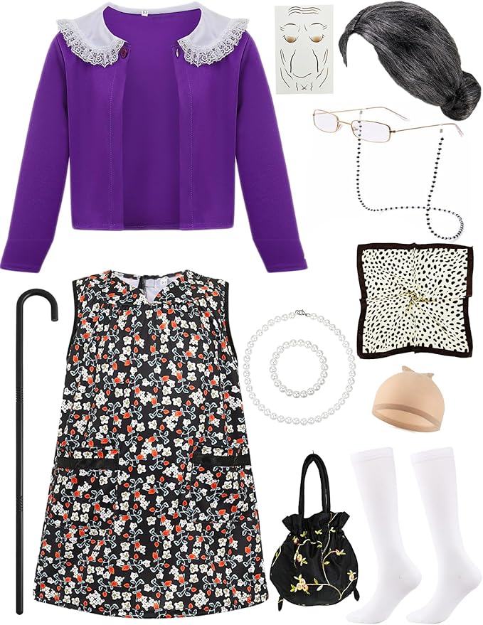 • Cute Kids Old Lady Costume Set: Watch your little daughter transform into a cute grandma with the 100 days of school old lady outfit designed by ZFQI for girls! The package includes a comfortable grandmother dress, purple knitwear, a realistic old lady wig, glasses with glasses chains, necklace, bracelet, earrings, handbag, scarf, brooch, gloves, socks, tattoo stickers, and a cane.