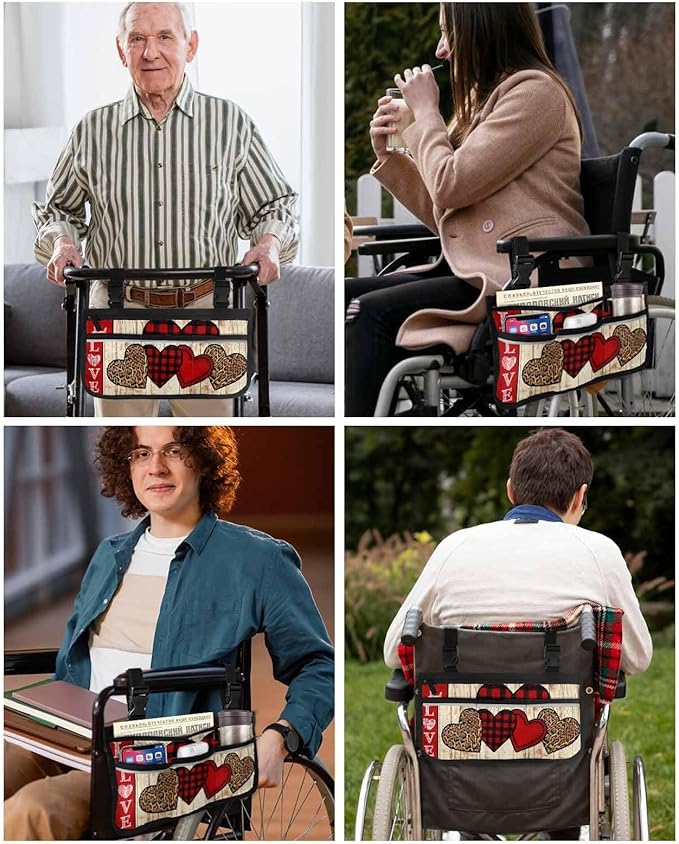Wheelchair Side Storage Bag Valentine's Day Red and Leopard Print Love Heart Armrest Pouch with Cup Holder and Reflective Strip Wheelchair Accessories Organizer Bags for Walkers Rollator