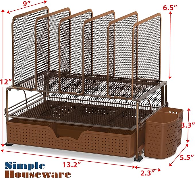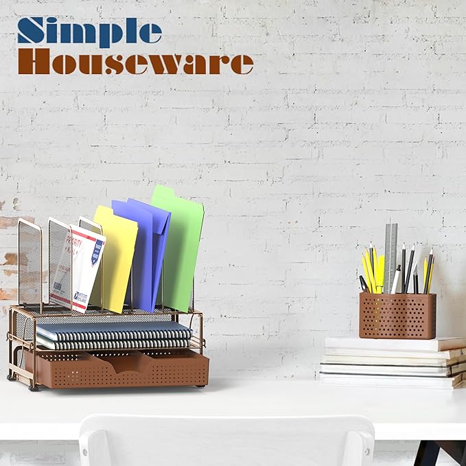 Simple Houseware Mesh Desk Organizer with Sliding Drawer, Double Tray and 5 Upright Sections, Copper