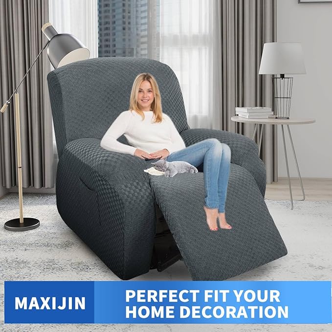 - 4 PIECES INCLUDED - MAXIJIN oversized recliner chair cover has exclusively 4 pieces designe, which includes one back cover, one seat cover and two arm covers. A Must-have magic recliner chair cover for recliner chair! Because the 4 pieces recliner slipcovers are separated, they will fit better, and not change the whole outlook of your recliner, looks like a customized slip cover. And the strong elastic edge on bottom help secure the recliner slip cover and ensure 100% NON-SLIP