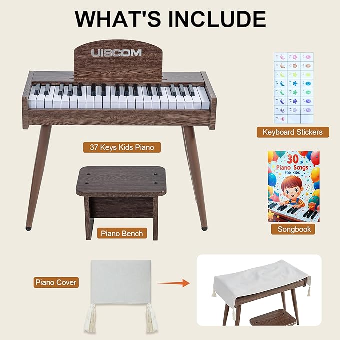 Kids Keyboard Piano, 37 Keys Digital Piano, Toddler Musical Instruments, Wooden Kids Piano with Bench, Toddler Piano for 3+ Girls and Boys, Walnut