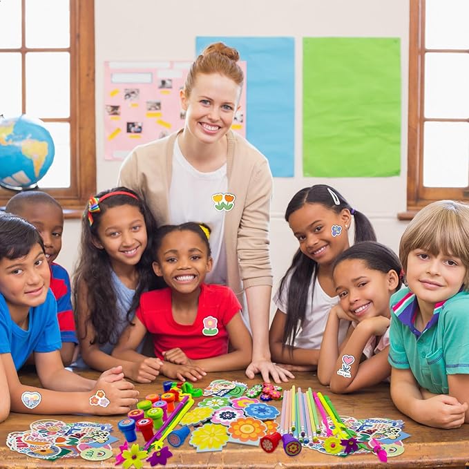 - Various Stationery Sets: our Spring Flower Classroom Party Favors includes 50 flower theme pvc stickers,12 notebooks, 12 pens,12 pencils, 12 erasers, 12 stamps, 12 pencil sharpeners, enough style and quantity to meet the needs of your daily use