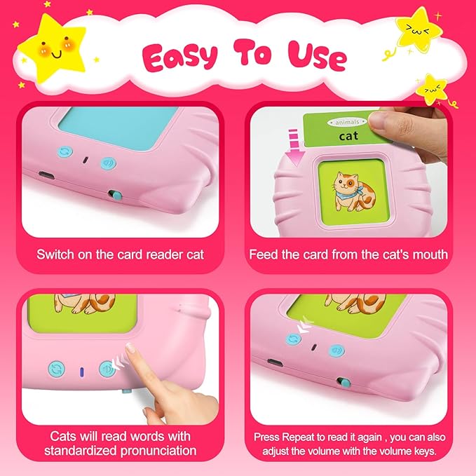 - [Educational Toys for Toddlers] - The talking flash cards reader designed as cute cat helps toddlers learning speaking, tailored for toddlers aged 1-6. With 248 words covering animals, vehicles, letters, numbers, food, fruits, vegetables, clothing, nature, colors, professions, shapes, and everyday items, this toy offers engaging educational-inspired interactions.
