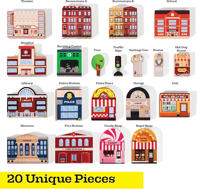- 20 PIECE SET - INCLUDES 15 WOODEN BUILDINGS - Hospital, School, Fire Station, Theater, Museum, Library, Candy Store, Pizza Shop, Brownstone A, Brownstone B, Garage, Bagel Shop, Recycling Center, Deli, Police Station INCLUDES 5 WOODEN SIGNS AND ACCESSORIES - Statue, Tree, Hot Dog Cart, Garbage Can, Traffic Light