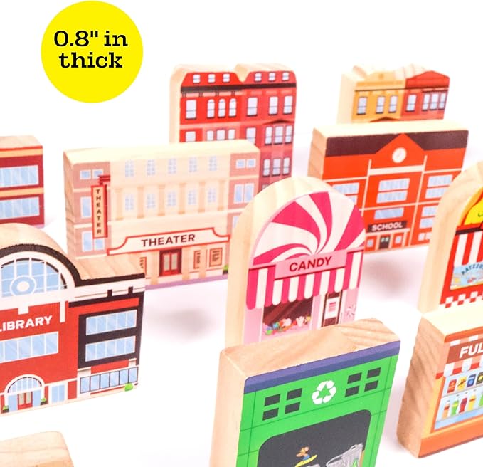 - WOODEN CITY PLAY SET HELPS WITH CREATIVITY TO MAKE THE MOST EXCITING AND FUN WOODEN RAILWAY! Town buildings add creative destinations to your train layout, great for Community Helpers
