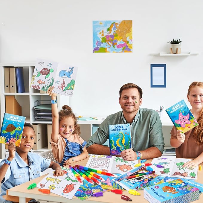 - Package Include: you will get 12 under the sea mini coloring books, 12 crayons in 8 colors, 12 slap bracelets, 12 ocean stampers, 12 ocean stickers, 12 make-a-face stickers, 12 color scratch, 12 clear gift bags. A complete seas animals party favor set for your use.