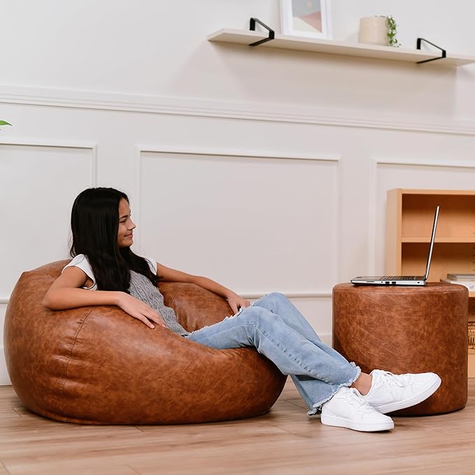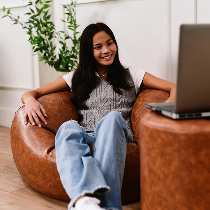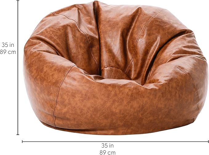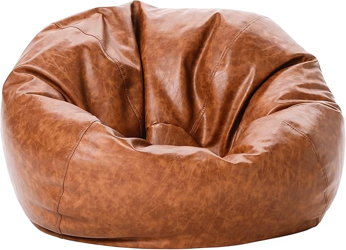 Factory Direct Partners 35" Rustic Western Bean Bag Chair; Distressed Faux Leather, Low to Ground for Reading, Playing Video Games and Relaxing; Flex Seating for Home and School - Hazelnut, 10478-322