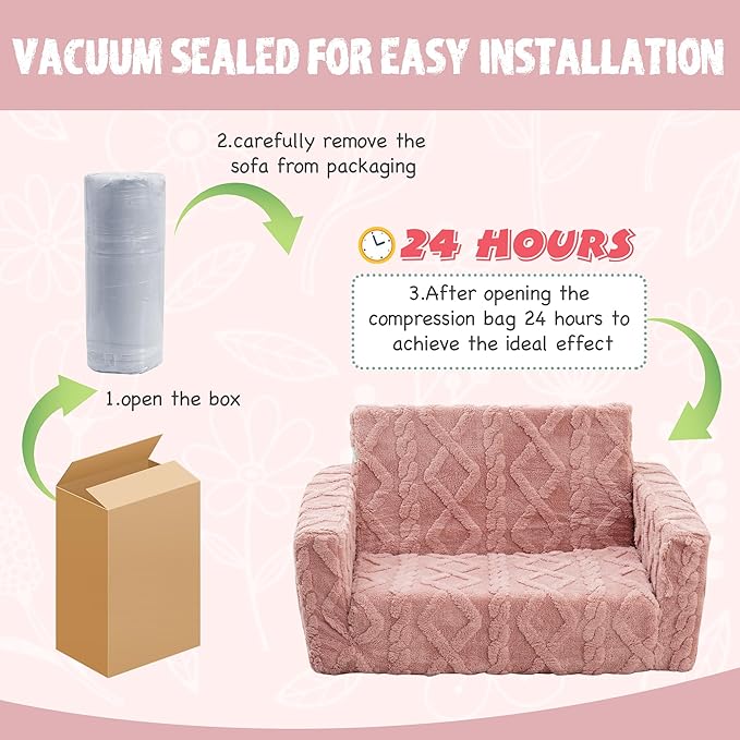 - 【No Installation Required】: The kids fold out couch comes in vacuum packing. Simply take it out and plump it up for 24 hours. Allowing 24 hours is best for the toddler chair to reach its full size.