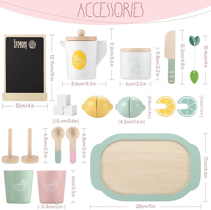 - Lemonade Playset -- Lemonade stand toy drinks comes with a pretend handle juicer and tons of toy treats like lemons. Little boys and girls will experience the joy of afternoon tea with this adorable wooden lemon tea party set and enjoy it for a long time pleasure