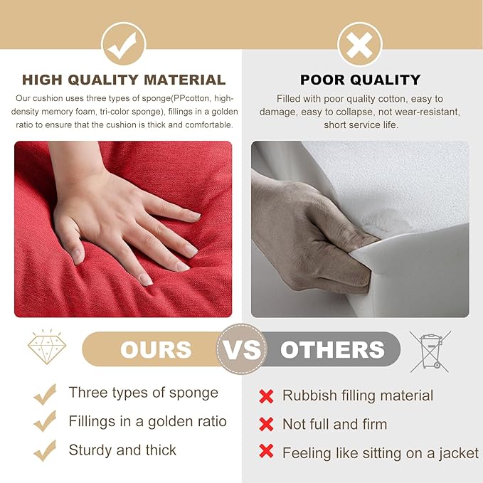 - 【STURDY AND THICK】After years of experience, our cushion factory uses three types of sponge(PP cotton, high-density memory foam, tri-color sponge), fillings in a golden ratio to ensure that the cushion is thick and does not collapse while being soft and comfortable. Avoid feeling like laying a jacket over your bench and feeling everything under it when sitting on the cushions.