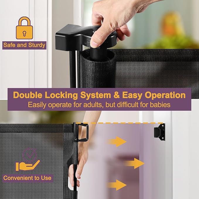 - 42" Extra Tall Retractable Gates: This extra tall baby gate is 42 inches tall and taller than other retractable baby gates to prevent your babies and dogs from jumping or climbing over it.