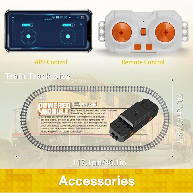 - 【Remote Control / APP Control】Mould King train model toy equipped with high-performance motors and smart chips, and supports two Bluetooth remote control operation modes: handheld remote control and mobile phone APP. This toy building block adopts a heavy duty motor that can deliver powerful power and rechargeable lithium-ion batterie that provide the best run time.