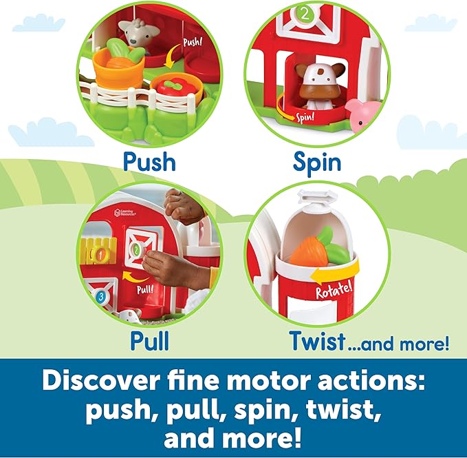 - Fine Motor Down on the Farm!: Discover this toddler learning toy’s fine motor actions—push the basket, pull and spin the doors, rotate the silo, and more!