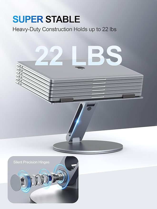 - Enhanced Stability, Protection & Silent Operation:Constructed from premium aluminum alloy, this folding computer holder for laptop ensures heavy duty stability with a large base to prevent wobbling or tipping. Its silent precision hinges enable noiseless repositioning - even during smooth folding adjustments - while non-slip silicone pads securely hold your notebook up to 22lbs, providing reliable scratch and slip resistance.