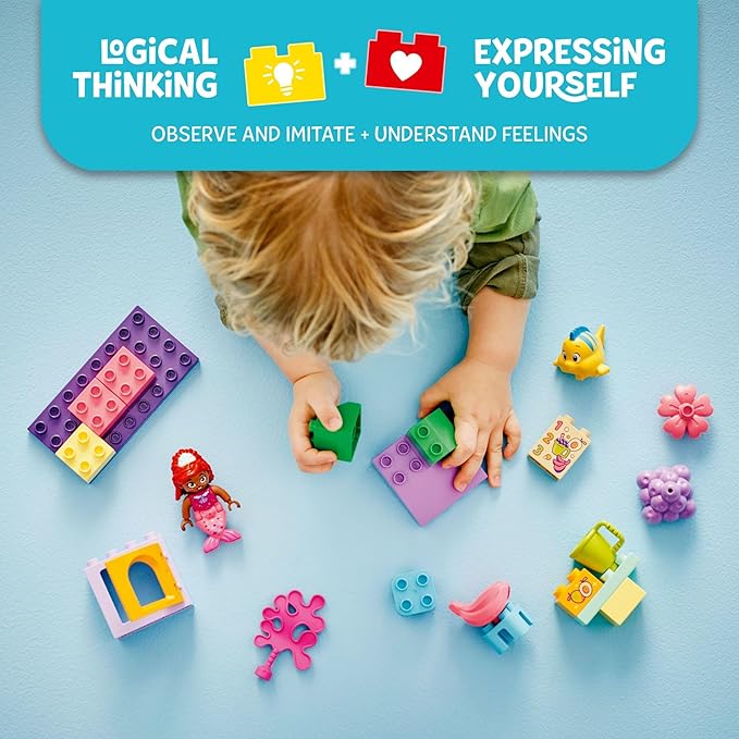 - 2 familiar characters – This role-play Little Mermaid toy for preschool kids comes with 2 LEGO DUPLO figures: Ariel and Flounder from the Disney Junior TV show Ariel