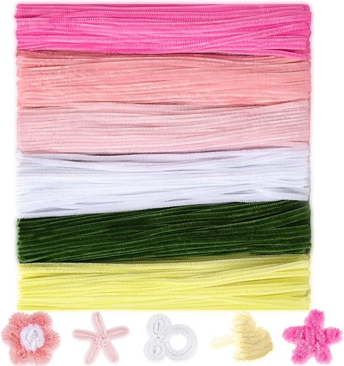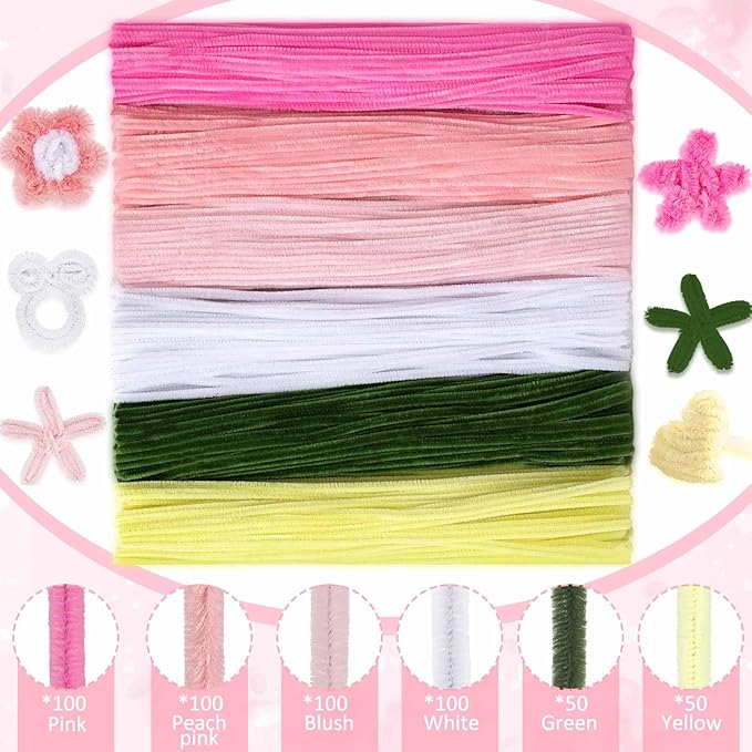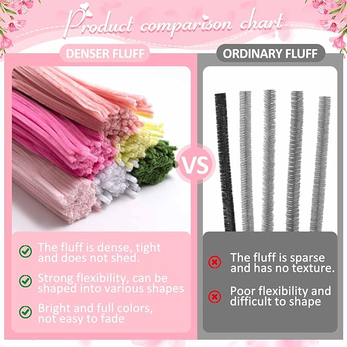 - Operational Across Multiple Platforms: be it projects, DIY crafts, decorative endeavors, or even as nice gifts, these pink flower pipe cleaners find their purpose in a plethora of applications; Its versatility, coupled with its vibrant colors and durability, makes it a nice tool for your art workshops, home decor crafts, or even as cute embellishments to gifts and presents