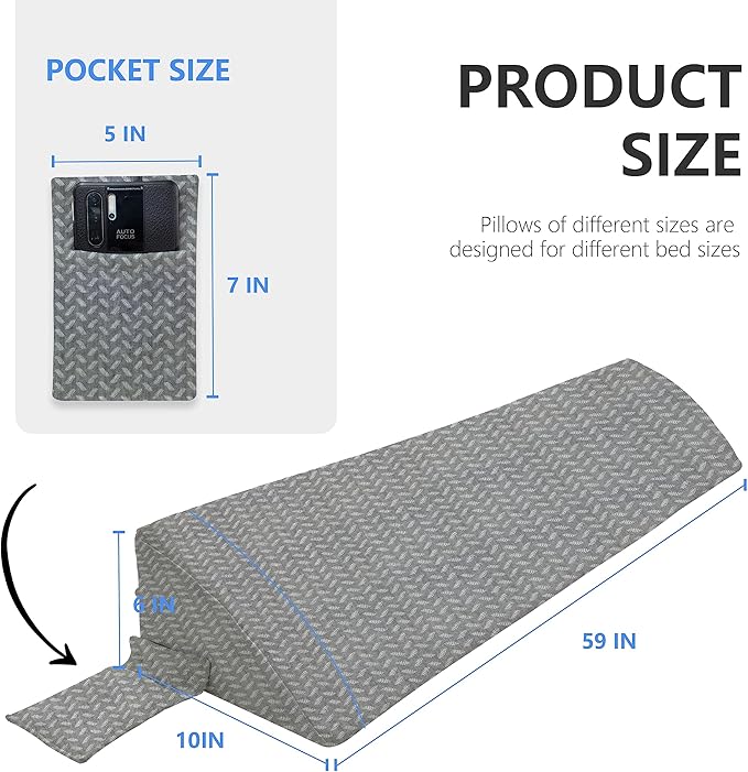 Bed Wedge Pillow for Headboard Gap Bed Mattress Gap Filler (0-8") Between Headboard/Wall and Mattress Grey Queen Size Foam Support Triangle Bloster Pillow Stoppers with 2 Pockets