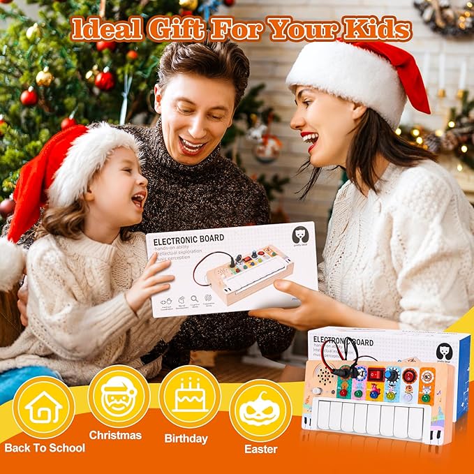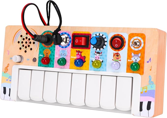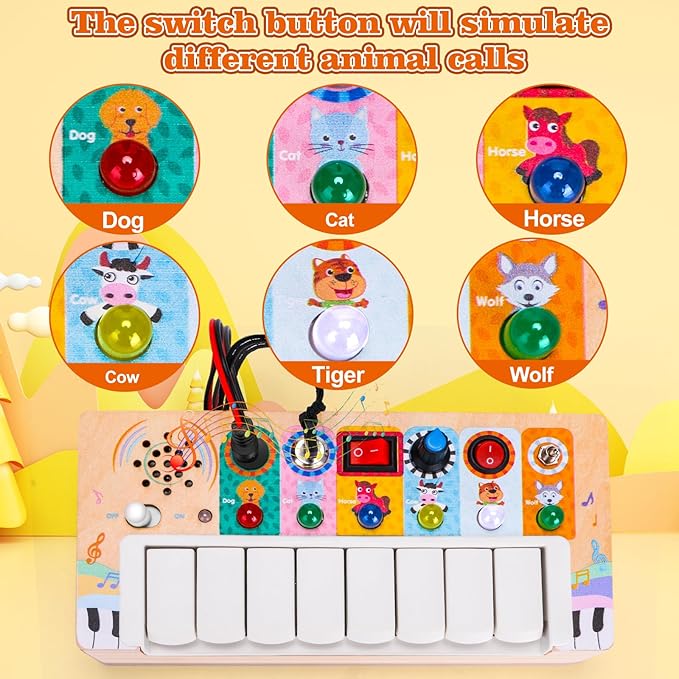 - Fun and Educational Toys: This baby wooden piano busy board is a Montessori toy that offers endless fun and learning opportunities for toddlers. 8 Piano Keys with 6 Light Switch of Animals Call, this sensory board will captivate and fascinate your child. It is the perfect toy for developing fine motor skills, hand-eye coordination, and color recognition.
