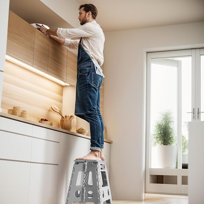 - Safety-Focused Design: Our lightweight folding step stool equipped with a non-slip surface, movable handle and the bottom corners are upgraded to black non-slip dot textured rubber straps to prevent slips and finger traps, improving a secure user experience.