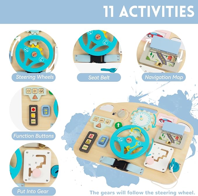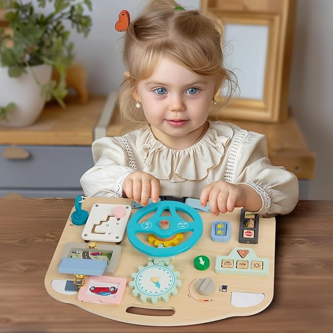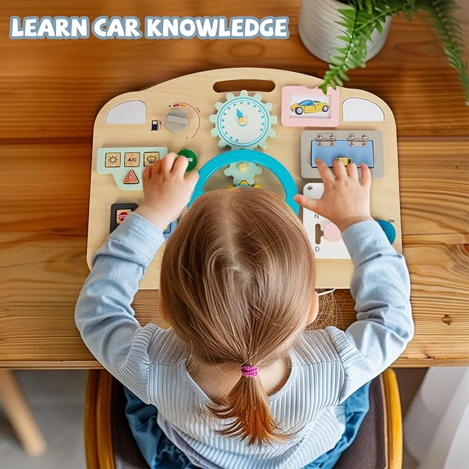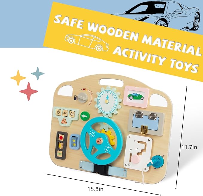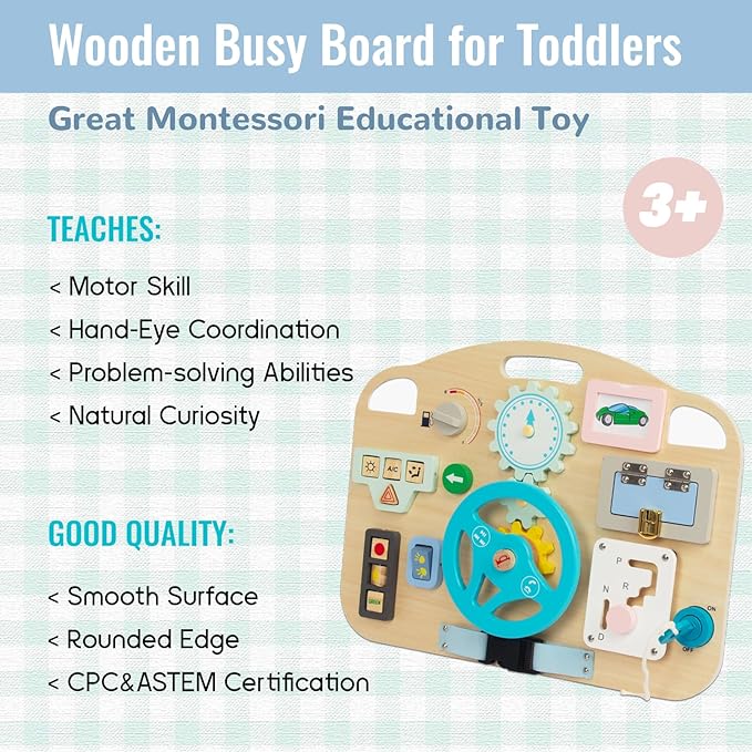 - GREAT GREAT SENSORY TOY: The Wooden Montessori Busy Board includes 11 different activities that keep your child busy and engaged, teaching kids the basic workings of everyday life in a simple, non-tech way.