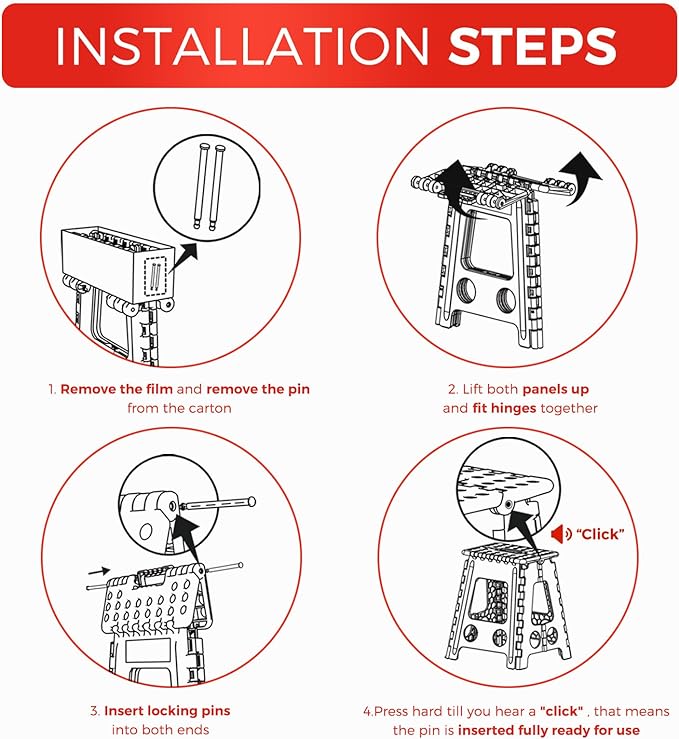 - Proper Use and Customer Serve: The collapsible step stool must be used on a dry and flat surface. Ensure that the stool is fully open before use and that you hear the Pins fixing "Click" sound. Don't stand on the edget of the stool with one foot or tiptoe. Don't move stool while in use. Our warranty is 3 months with proper use. Customer service Available 24/7. If the pins lost unexpectedly, please do not hesitate to contact us for a replacement.