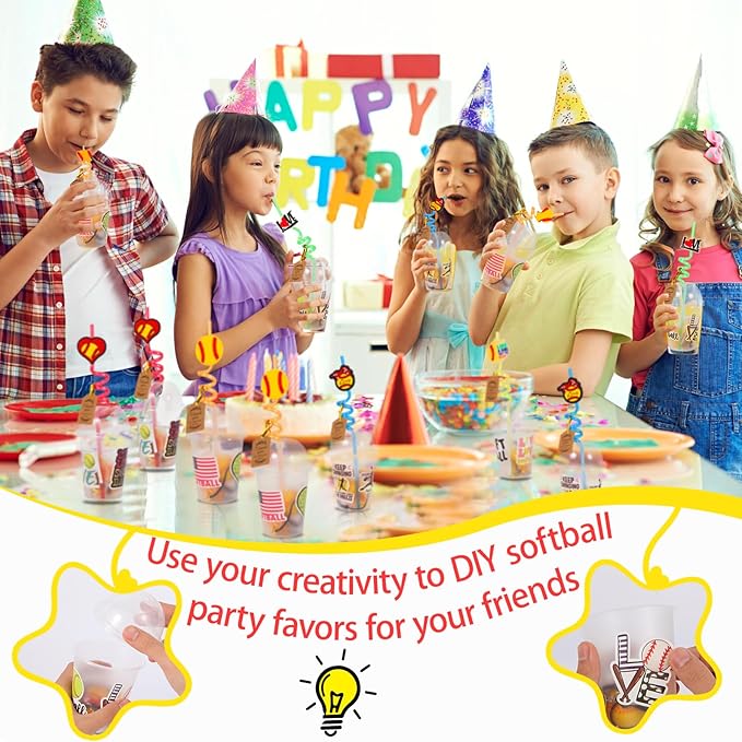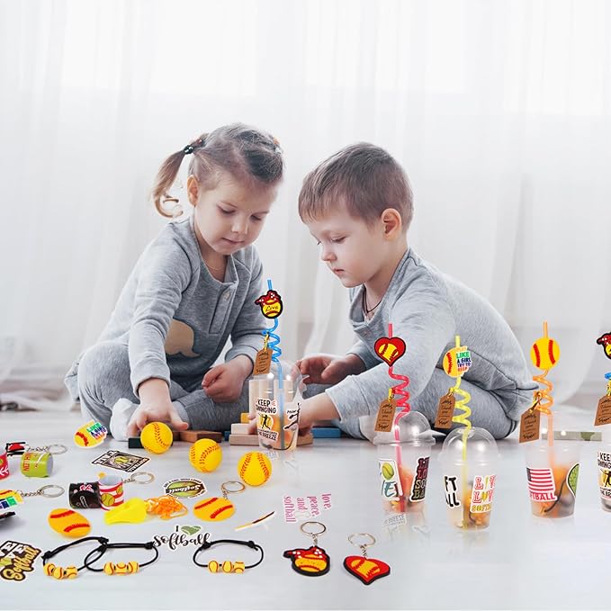 - Large Quantity Softball Party Favors: You will receive 12 pcs cups with dome lids, 12 pcs softball straws, 12 pcs softball whistles, 12 pcs softball key chains, 12 pcs mini softball, 12 pcs softball bracelets, 12 pcs slap bracelets, 12 pcs thank you tags, 12 pcs twist ties, 50 pcs softball themed stickers, sufficient quantity to meet your daily or party needs.